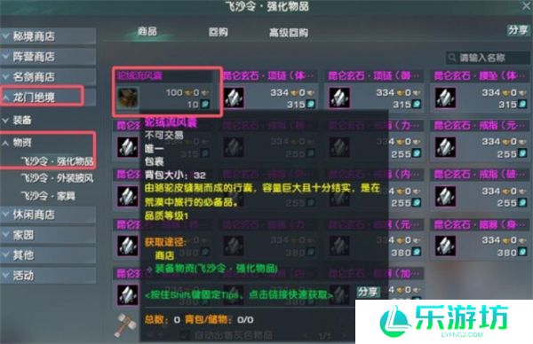 获取方法:通过参与“吃鸡”玩法获得飞沙令。只需0个飞沙令即可购买到32格的大容量背包。