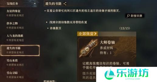 14、收集齐15个散页后,返回任务起始地点提交任务,即可获得“龙息神寂大师卷轴”作为奖励。