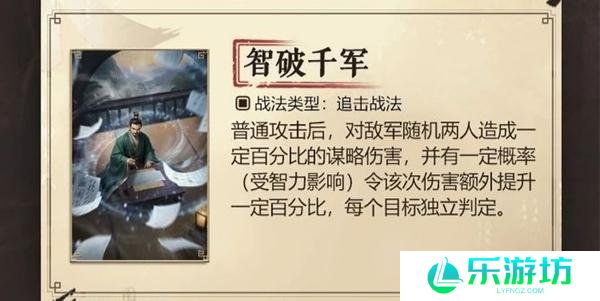 普通攻击后,对敌军随机两人造成一定百分比的谋略伤害,并有一定概率(受智力影响)令该次伤害额外提升一定百分比,每个目标独立判定。