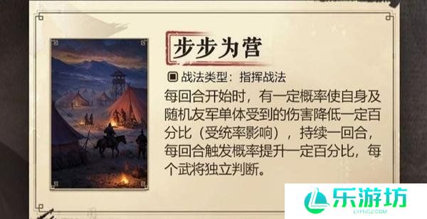 每回合开始时,有一定概率使自身及随机友军单体受到的伤害降低一定百分比(受统率影响),持续一回合,每回合触发概率提升一定百分比,每个武将独立判断。