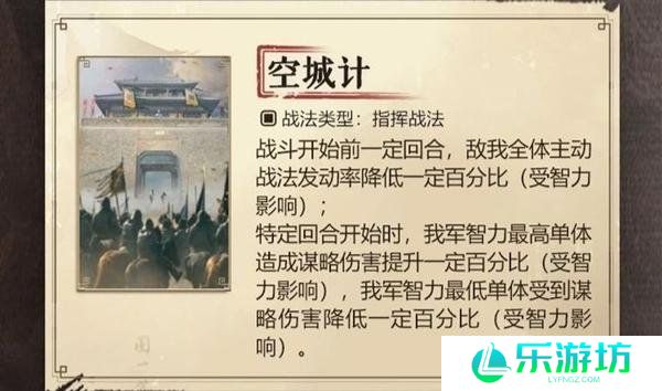 特定回合开始时,我军智力最高单体造成谋略伤害提升一定百分比(受智力影响),我军智力最低单体受到谋略伤害降低一定百分比(受智力影响)。