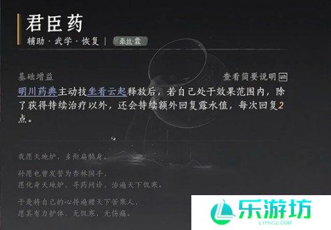 1、君臣药和千丝蛊分别针对明川药典和千香引魂蛊的特性,提供露水回复和额外治疗效果,增强武学的持续作战能力。