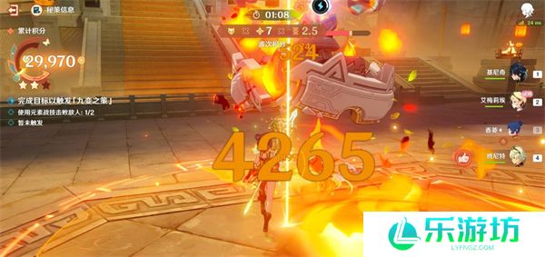燃烧反应:利用火元素角色(如香菱或火主)与草元素角色(如基尼奇或艾梅莉埃)的配合,触发燃烧反应并打出高额伤害。