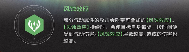 部分气动属性的攻击会附带可叠加的【风蚀效应】。【风蚀效应】持续时,会使目标自身每隔一段时间便受到气动伤害。【风蚀效应】层数越高,造成的伤害也越高。