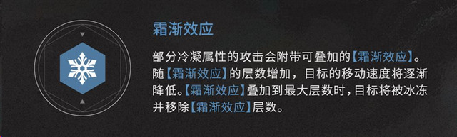 部分冷凝属性的攻击会附带可叠加的【霜渐效应】。随【霜渐效应】的层数增加,目标的移动速度将逐渐降低。【霜渐效应】叠加到最大层数时,目标将被冰冻并移除【霜渐效应】层数。