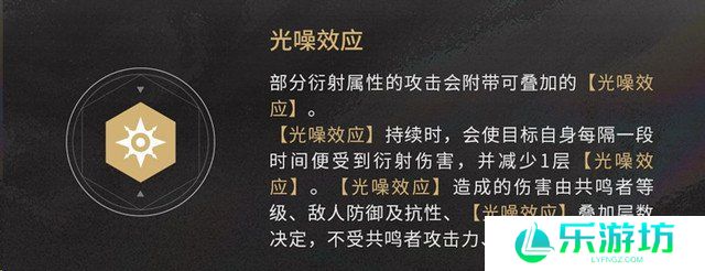 部分衍射属性的攻击会附带可叠加的【光噪效应】【光噪效应】持续时,会使目标自身每隔一段时间便受到衍射伤害,并减少1层【光噪效应】。【光噪效应】造成的伤害由共鸣者等级、敌人防御及抗性、【光噪效应】叠加层数决定,不受共鸣者攻击力、暴击等影响。