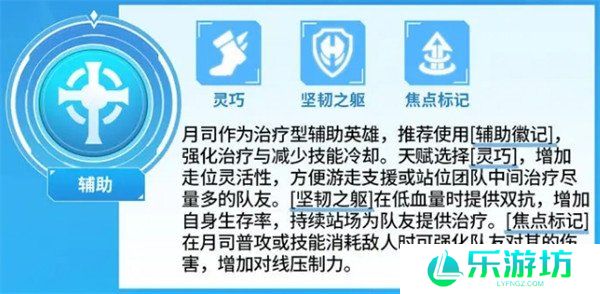 月司作为治疗型辅助英雄,推荐使用【辅助微记】强化治疗与减少技能冷却。天赋选择【灵巧】,增加走位灵活性,方便游走支援或站位团队中间治疗尽量多的队友。【坚韧之躯】在低血量时提供双抗,增加自身生存率,持续站场为队友提供治疗。【焦点标记】在月司普攻或技能消耗敌人时可强化队友对其的伤害,增加对线压制力。