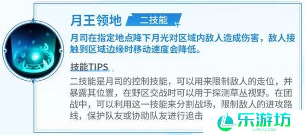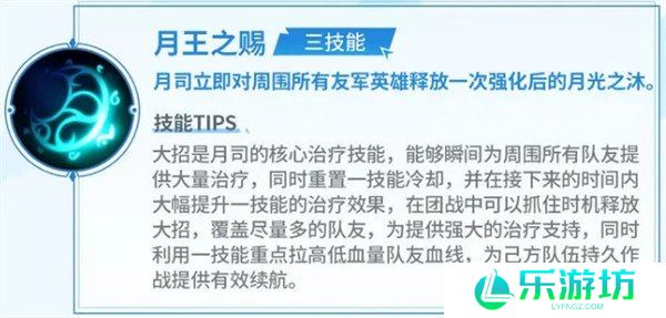 4级后的月司有很强的团队恢复能力,可以大量恢复已方英雄的生命值,在团战中相当于第二条命,中期多跟团,注意已方关键输出位的位置,使用1技能和大招为其提供续航和保护。