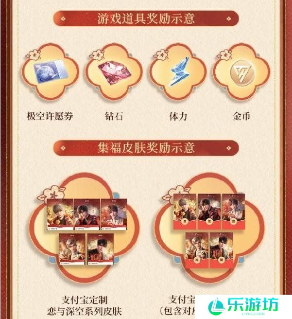 集齐五张福卡合成后,可获得极空许愿券、钻石、支付宝定制的恋与深空系列皮肤、支付宝集福红包皮肤(包含随机男主语音)奖励。
