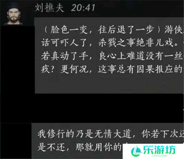 强烈的威胁加上修行背景,表达出一种冷酷无情的决心,适合与刘樵夫的关系较差时使用,以求快速解决问题,但小心好感度降低。
