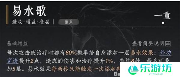 易水歌:增加10穿透和5%伤害,这是输出时必带的心法。穿透效果对敌方防御有很好的克制作用,提升整体伤害。