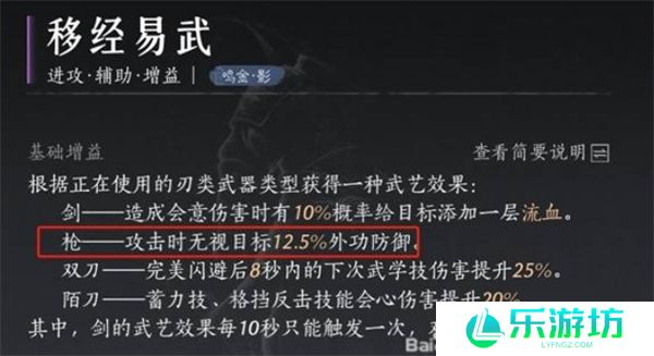 移经易武:枪系的12.5%攻击穿透可以显著提高伤害输出,这个心法是枪法的核心之一,极大增强了对敌方的输出威胁。