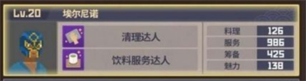 埃尔尼诺具备清理达人和饮料服务达人技能,能够有效提高大堂的运营效率。清理能力可以让大堂保持整洁,饮料服务达人技能则能加快饮料的制作和送达速度,提升顾客满意度,从而提高店铺的整体评分和营业额。